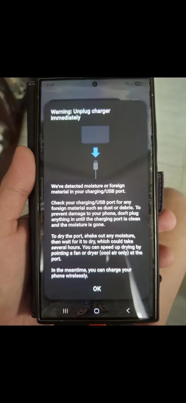 “Unplug Charger. Moisture has been detected in your charger/USB port.”